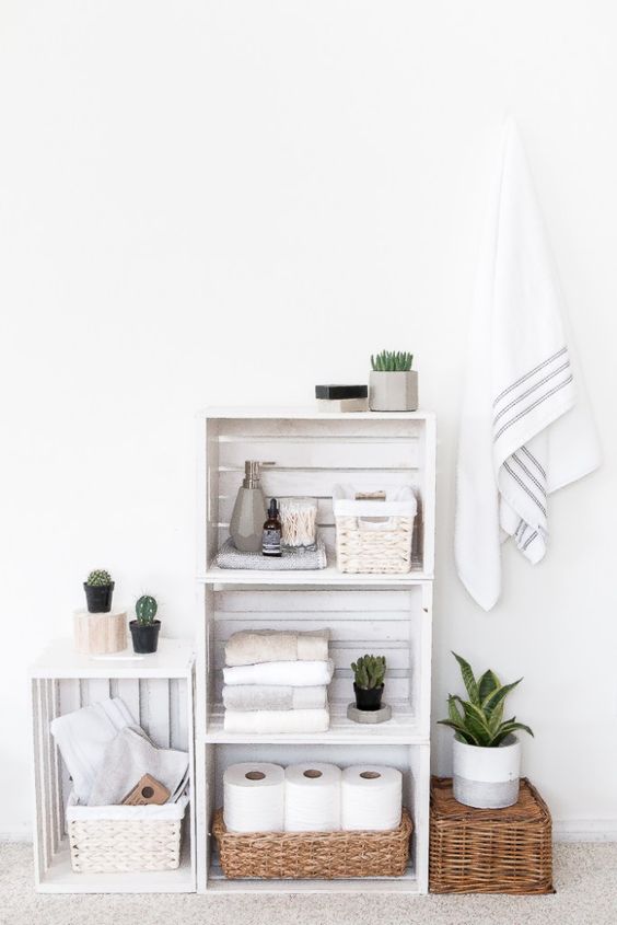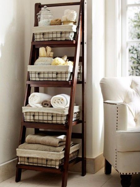 Izbacite sve nepotrebne stvari, ostavite one peškire koje zaista koristite, presložite kozmetiku i ostavite samo ono što svakodnevno koristite. Duboke police ispod lavaboa iskoristite pametno i u njih ubacite peškire. Dodajte otvorene police na koje možete staviti drvene korpice za odlaganje, biće vidljivo i otovoriće prostoriju. Tu su i merdevine koje možete iskoristiti kao police.