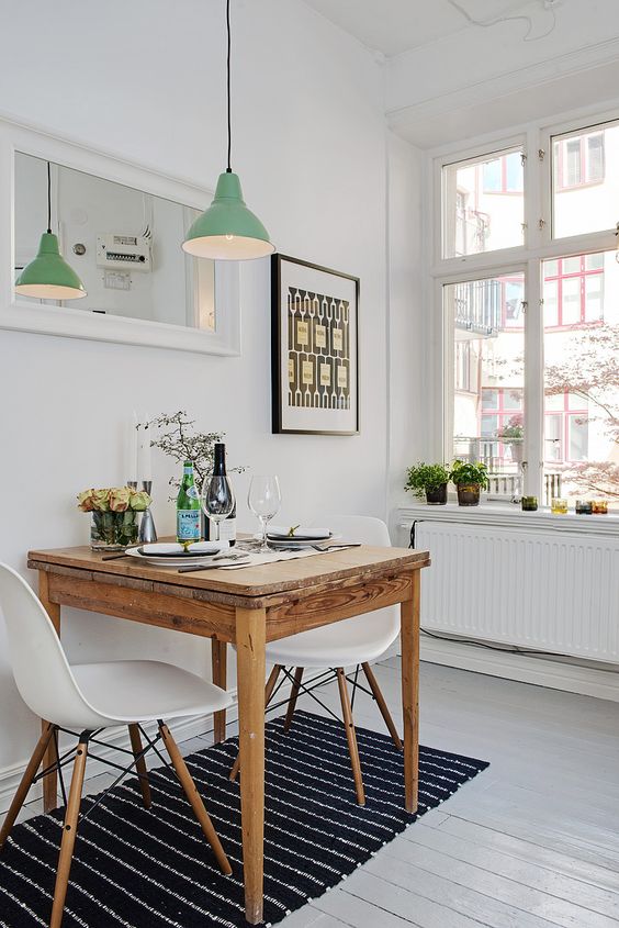 Ukoliko imate prostora odvojite trpezariju od kuhinje, kako biste imali definisan prostor samo za trpezariju. Kada imate definisan prostor, vizuelni efekat je odmah drugačiji. Za vizuelno povećanja prostora najbolje je da iznad trpezarijskog stola postavite luster koji će lepo osvetliti prostor i skrenuti pažnju na njega. Postoje specijalizovane prodavnice za lustere, gde možete izabrati neobičan luster koji će dati prostoru wow efekat. Zanimljiv tepih ispod trpezarisjkog stola je još jedan detalj koji vam može poslužiti za uređenje male trpezarije.
