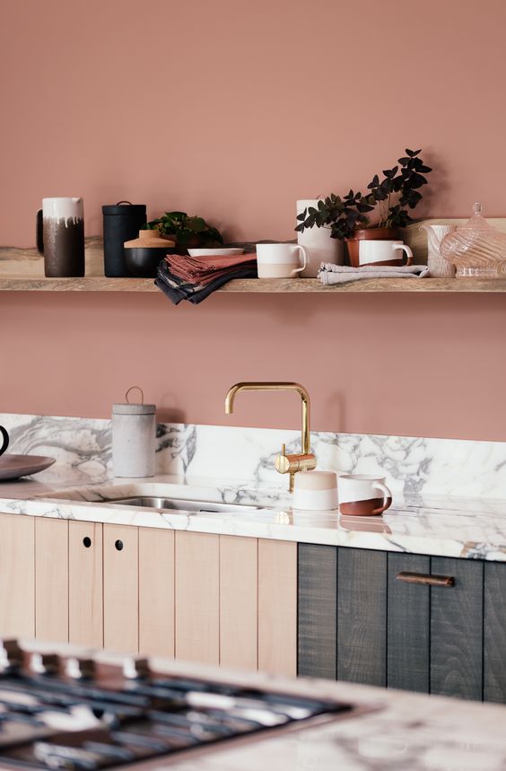 Puderasti tonovi u kuhinji nisu do sada bili najčešći izbor u našim domovima, iako ove boje daju toplinu i osećaj kao da ste na oblaku. Kuhinja u roze puderastoj boji će učiniti da vam ona postane omiljena prostorija. Ukoliko ne želite da cela kuhinja bude u ovim bojama, možete se odlučiti makar za posuđe u toplim tonovima.